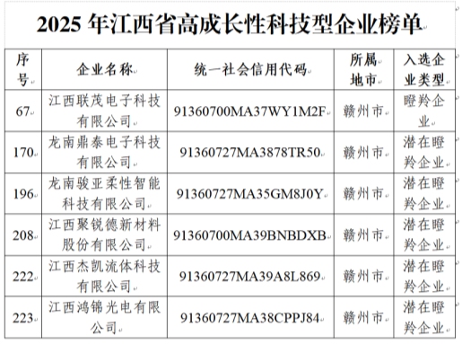 其中,江西联茂电子科技有限公司凭借突出的发展潜力与创新实力,成功认定为瞪羚企业;龙南鼎泰电子科技有限公司、龙南骏亚柔性智能科技有限公司、江西聚锐德新材料股份有限公司、江西杰凯流体科技有限公司、江西鸿锦光电有限公司等5家企业发展迅猛,成功认定为潜在瞪羚企业。