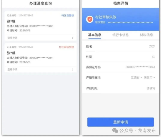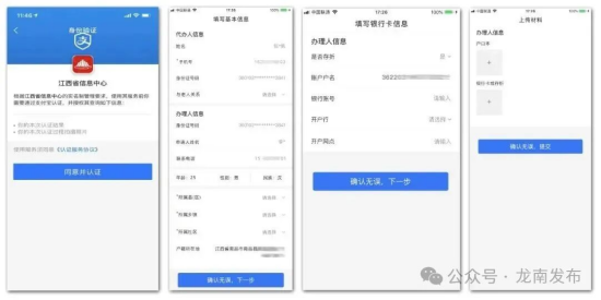 4.完成刷脸识别,填写申请人基本信息与银行卡信息(其中的办理部门信息逐级选择,精确到村社一级),姓名、性别、身份证号、户籍所在地等基本信息中自动获取,现居住地和办理部门手动填写。