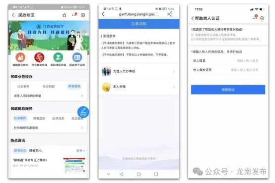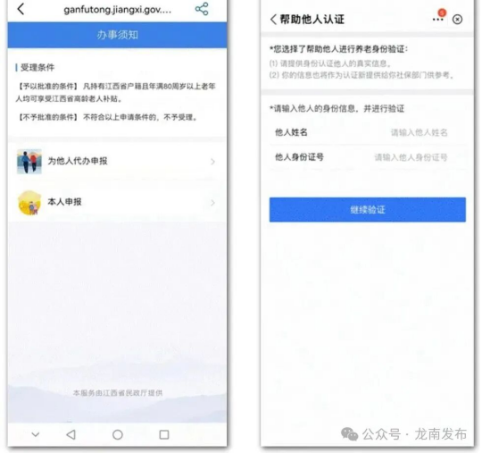 7.符合高龄津贴发放标准的老人,需定期在赣服通上做生存认证,分为本人申报与为他人代办申报,如选择为他人代办申报,则需要输入办理人的姓名与身份证号码。