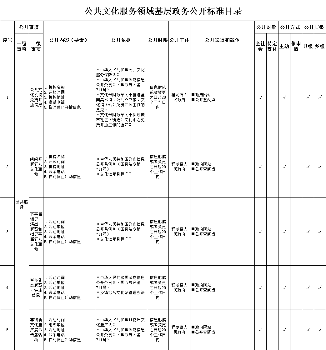 【公共文化服务】程龙镇公共文化服务领域基层政务公开标准目录