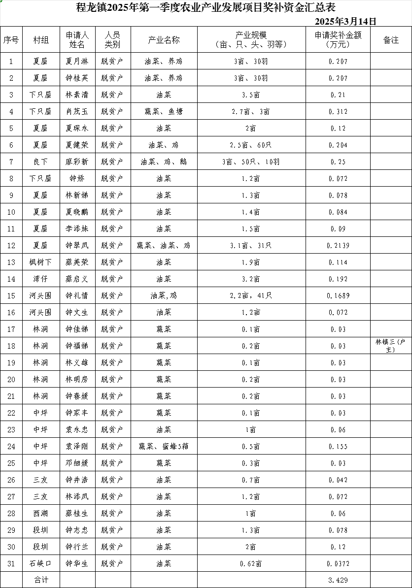 【涉农补贴】程龙镇2025年龙南市农业产业发展项目奖补资金汇总表(第一批)