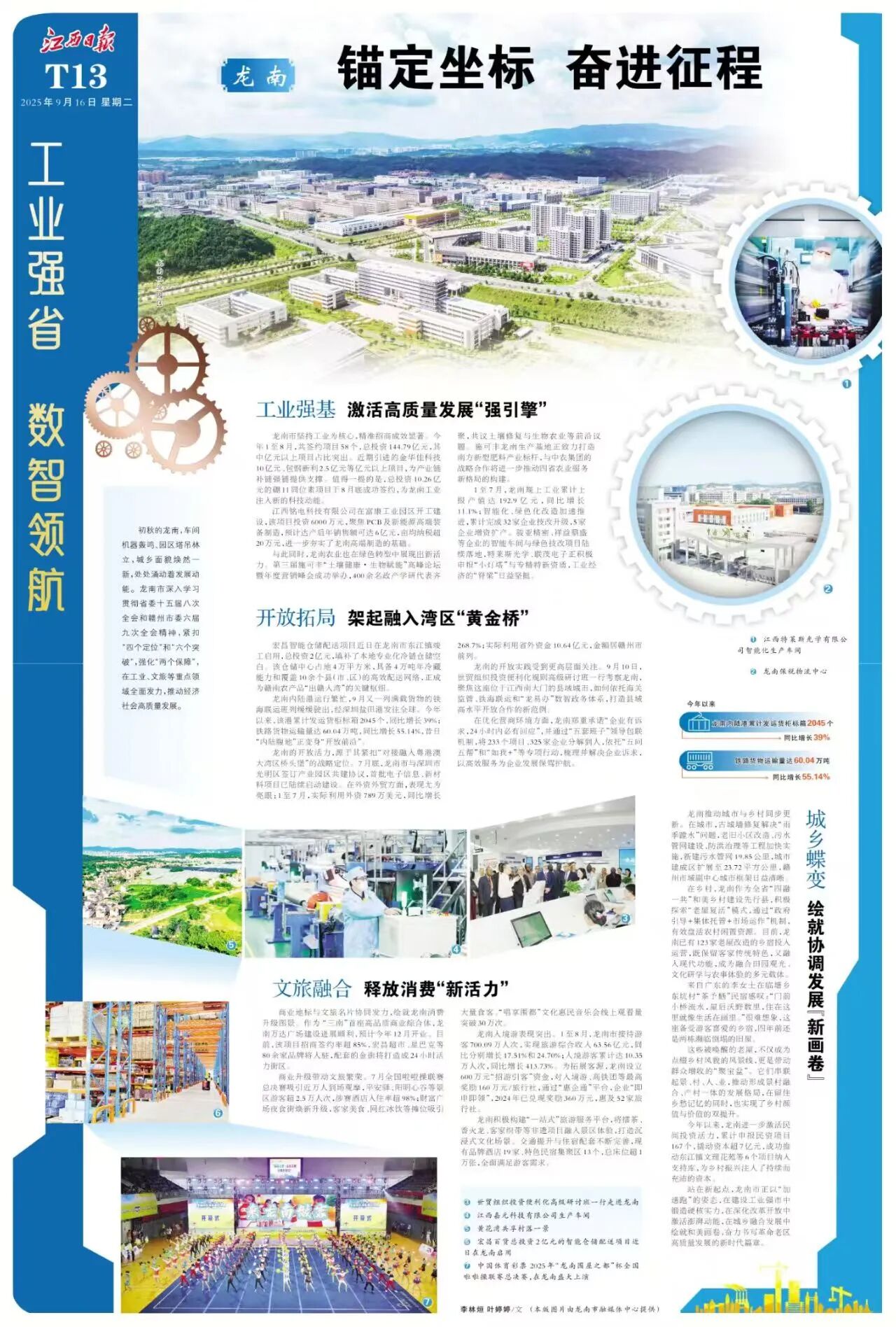 初秋的龙南,车间机器轰鸣、园区塔吊林立,城乡面貌焕然一新,处处涌动着发展动能。龙南市深入学习贯彻省委十五届八次全会和赣州市委六届九次全会精神,紧扣“四个定位”和“六个突破”,强化“两个保障”,在工业、文旅等重点领域全面发力,推动经济社会高质量发展。