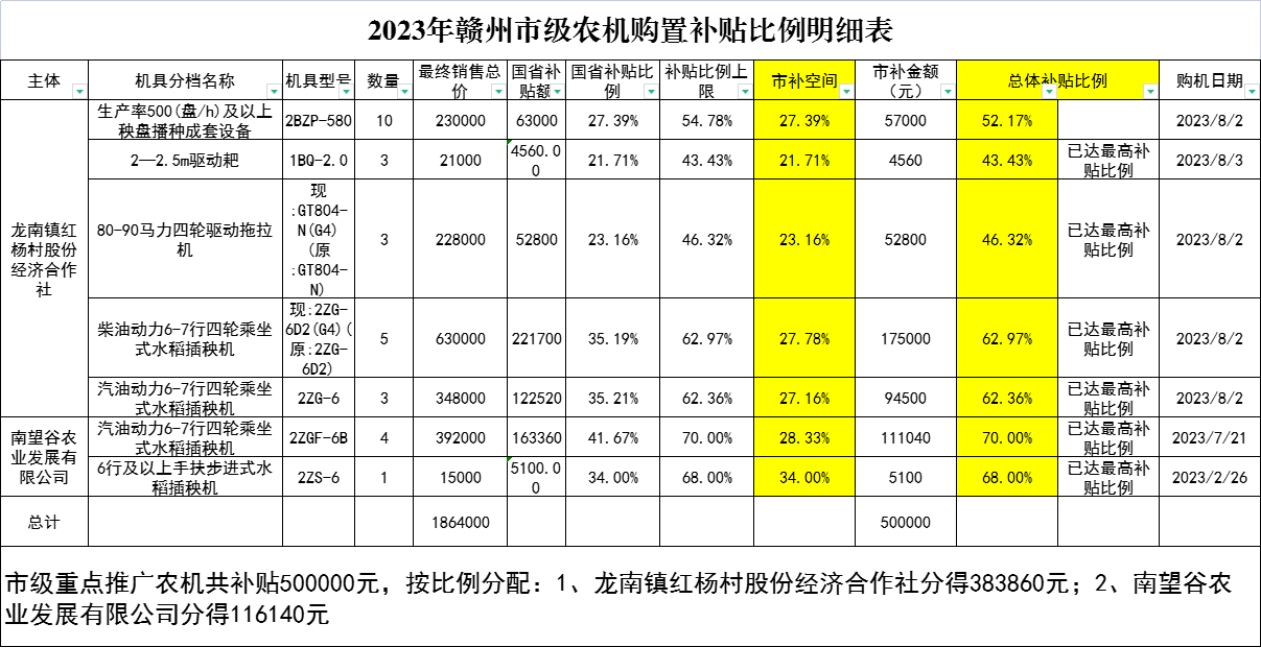 上级安排我市2023年市级重点推广农机购置补贴专项资金50万元,经企业自主申报、县级严格筛选,局党组会讨论,龙南镇红杨村股份经济合作社、南望谷农业发展有限公司两个主体符合支持条件,龙南镇红杨村股份经济合作社安排奖补资金383860元,南望谷农业发展有限公司安排奖补资金116140元。