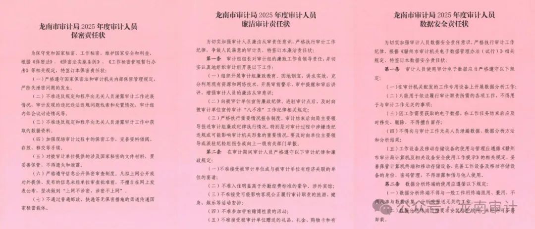 坚持问题导向,聚焦主责主业,组织全体审计干部签订廉洁责任状、保密责任状、数据安全责任状,大处着眼,细处着手,明确审计人员在廉洁、保密、数据安全方面的责任和义务。