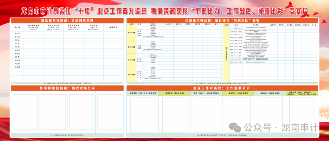 推进审计“十项”重点工作挂帅领衔,开展审计项目一线“晒现场、晒进度、晒成效,比干劲、比质量、比作风”竞赛,通过“一图三表”晒绩亮丑。