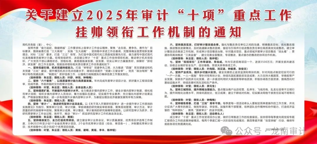 龙南市审计局深入学习贯彻习近平总书记关于审计工作的重要讲话和重要指示批示精神,围绕构建集中统一、全面覆盖、权威高效的审计监督体系,将“科学规范提升年”行动与开展深入贯彻中央八项规定精神学习教育紧密结合起来,深化改革创新,加强自身建设,高质量审计监督护航经济社会高质量发展。