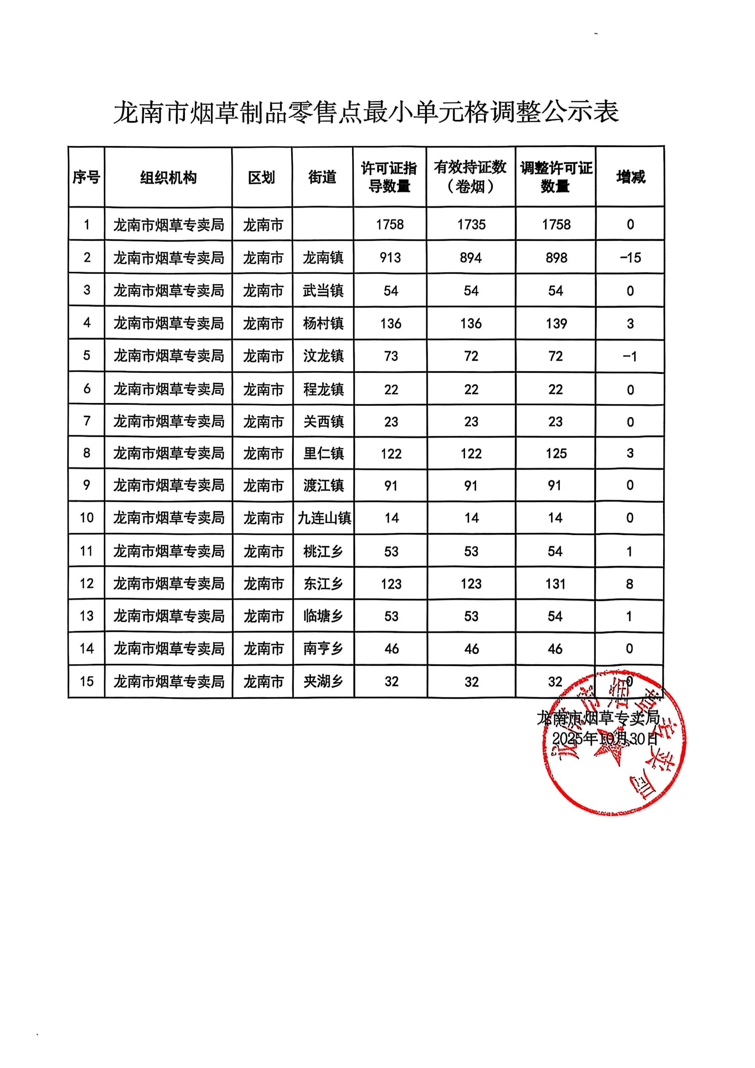 龙南市烟草制品零售点最小单元格调整公示表