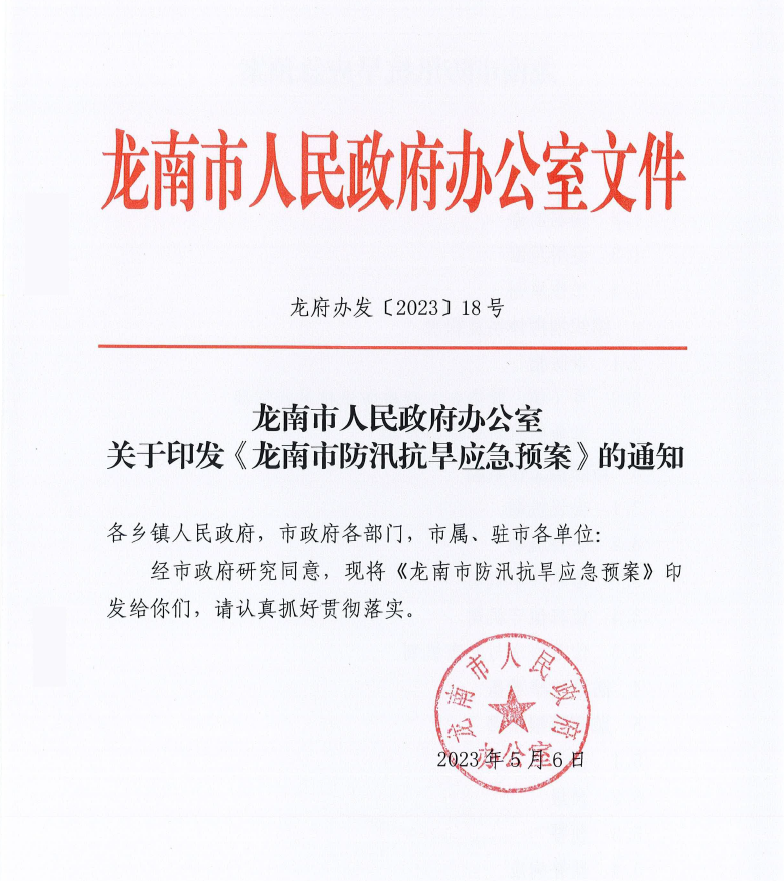 5.8龙府办发〔2023〕18号关于印发《龙南市防汛抗旱应急预案》的通知
