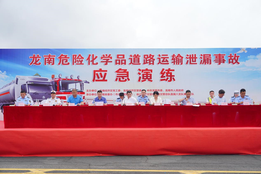 为深入贯彻习近平总书记关于应急管理工作的重要论述,实现由“被动应急”向“主动应急”转变的指示要求,进一步规范危险化学品运输道路交通事故应急处置工作,提高事故救援和应急处置水平。5月31日上午10时,龙南2024年危险化学品道路运输事故应急救援实战演练在省公安厅交管局高速交警总队直属八支队第七大队训练场举行。龙南经开区党工委委员、管委会副主任赖子安,龙南市委常委、市政府常务副市长肖立,龙南市政府副市长、公安局局长刘熙华,龙南经开区安环办主任郭志勇等区市领导现场观摩演练。区安环办、应急、消防、生态、交通、卫健、公安交管、里仁镇等职能单位和属地政府共计100余人参加此次演练。