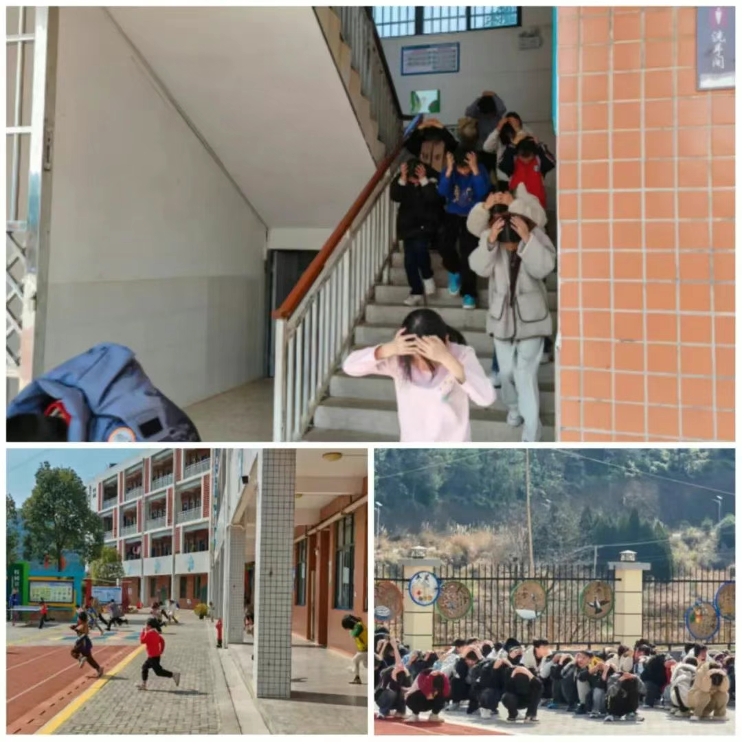 学校组织全体师生开展消防防震综合应急演练,在教师引导下,学生快速完成"伏地、遮挡、抓牢"避震动作,随后护头沿预定路线有序疏散至操场。