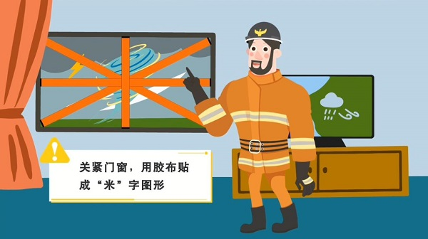 减少外出,加固容易被吹动的搭建物,关紧门窗,用胶布贴成“米”字图形。