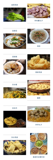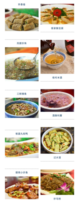 客家美食源于中原,秉承汉唐遗风,融入客家乡风,别具一番风味。炸春卷、炒乌粉、酿豆腐、板盖丸焖鸭、过水溜,凤眼珍珠汤、捶鱼汤,一碗菜,一道汤,可以品尝到沉淀了千年的味道。