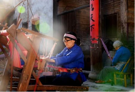龙南客家织带制作技艺 客家冬头帕由披肩、护额、丝带三部分组成。其中客家织带是重要组成部分,也是龙南最具代表性的传统手工技艺之一,龙南客家织带由红、黑、白、蓝等彩色丝线编织而成,织带图案有祈福纹样、动植物纹样、文字纹样等。以前的客家女子在出嫁时标配有六根客家织带作为嫁妆,寓意“带带(代代)相传”。
