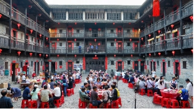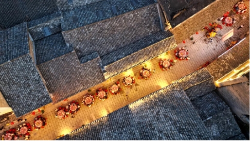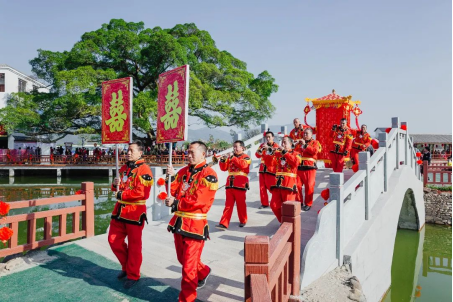 赣南客家围屋习俗2006年,赣南客家围屋习俗被列入省级非遗项目名录。包含客家时节习俗、服饰习俗、饮食习俗、居住习俗、婚俗等,是客家民系文化的重要组成部分。赣南客家围屋习俗中的婚俗是客家五大人生礼俗中最为重要的礼俗,传统客家婚俗都要经过从婚前阶段的相亲、查人家、扎庚、睄节、送日子,到婚事礼俗中的担席、暖轿、接亲、哭嫁、送嫁、婚宴,以及婚后礼俗中的三朝等仪式。婚俗中的祖宗三袋、火筒、公婆鸡、公婆灯、哭嫁、新娘出嫁时顶米筛、入洞房时踩红筷子、洞房同心餐,这些独特的风俗,赋予了龙南婚嫁浓郁的客家特色。
