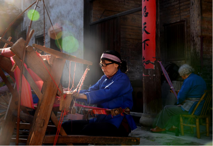 在全国重点文物保护单位----龙南市关西新围,常常能看到一位身着蓝布衫、头戴冬头帕的客家妇女安静地编织客家织带。她就是赣州市级非物质文化遗产龙南客家冬头帕织带技艺传承人廖秋华。