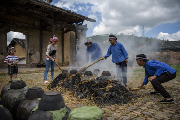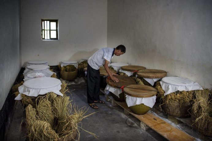 第六步,焐酒,客家龙拿人叫焙酒。焐酒工作流程:将米酒放入酒坛中→用大片青菜叶或泥瓦盖密封→酒缸缸顶及周围用稻草和谷壳铺平→点燃稻草→用火至焙酒沸腾→自然冷却→去除周围稻草灰→将酒倒入干净的酒坛中存放。
