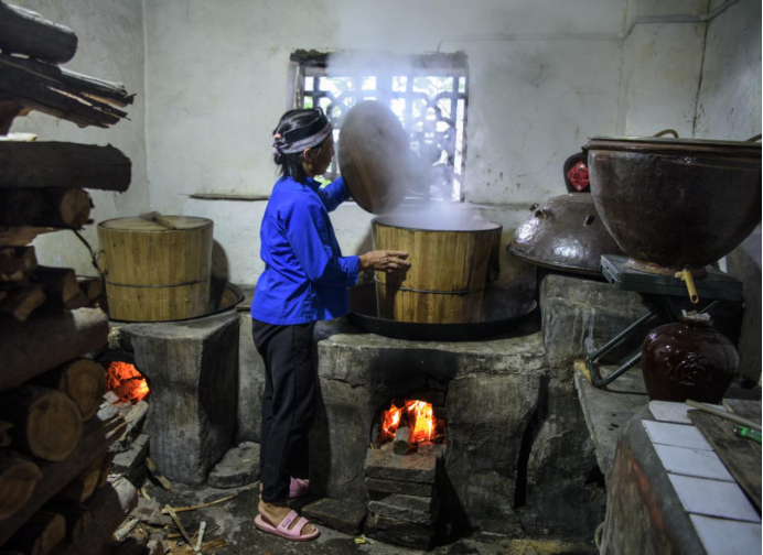 第二步,蒸糯米饭。把酿酒用的糯谷碾去金灿灿外壳之后,倒入竹篼里,用山泉水反复冲洗后放入大饭甑里,用大火蒸熟,直到糯米变成一饭甑晶莹剔透的糯米饭,复将饭甑移到大陶钵上。