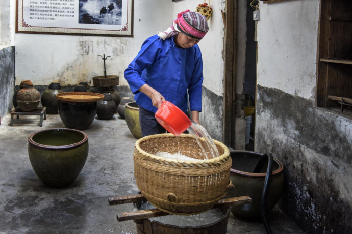 客家人蒸制米酒的工艺流程不是很复杂。酿酒时,首先是清洗酿酒工具。把酒坛搬到溪流中,用黄黄的细沙洗去污物,让清凉的泉水(或者井水)反复冲洗,置放在阴凉处风干。