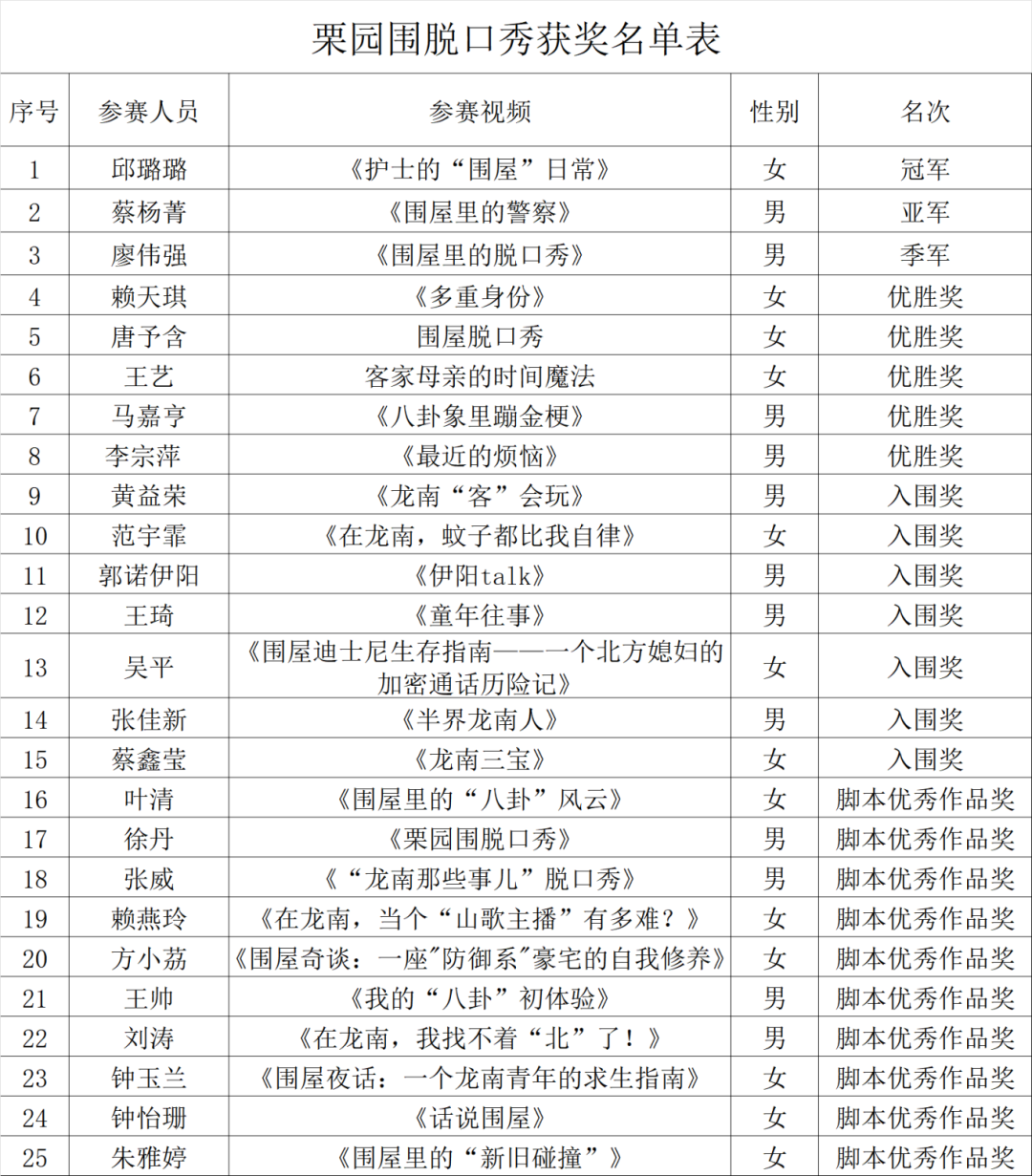 经过激烈角逐,邱璐璐凭借作品《护士的“围屋”日常》夺得冠军。她以细腻幽默的叙述,将职业特色与围屋生活巧妙结合,赢得评委和观众的一致好评。