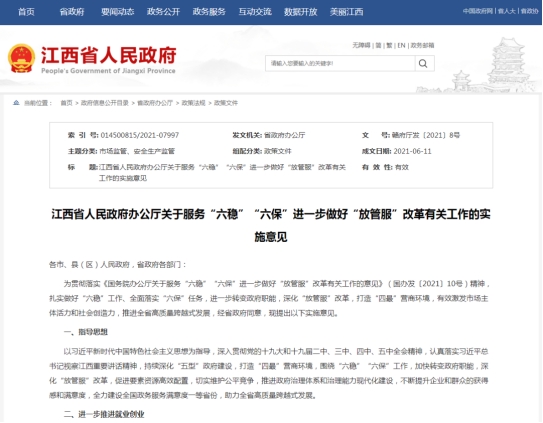 近日,江西印发了《江西省人民政府办公厅关于服务“六稳”“六保”进一步做好“放管服”改革有关工作的实施意见》(以下简称《实施意见》),要求进一步推进就业创业、进一步减轻市场主体负担、进一步优化投资审批服务、进一步清除消费制度性障碍、进一步促进稳外贸稳外资、进一步提升民生服务水平和进一步加强事中事后监管,共提出24条具体措施。