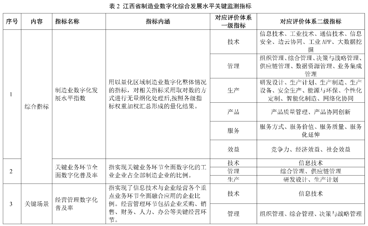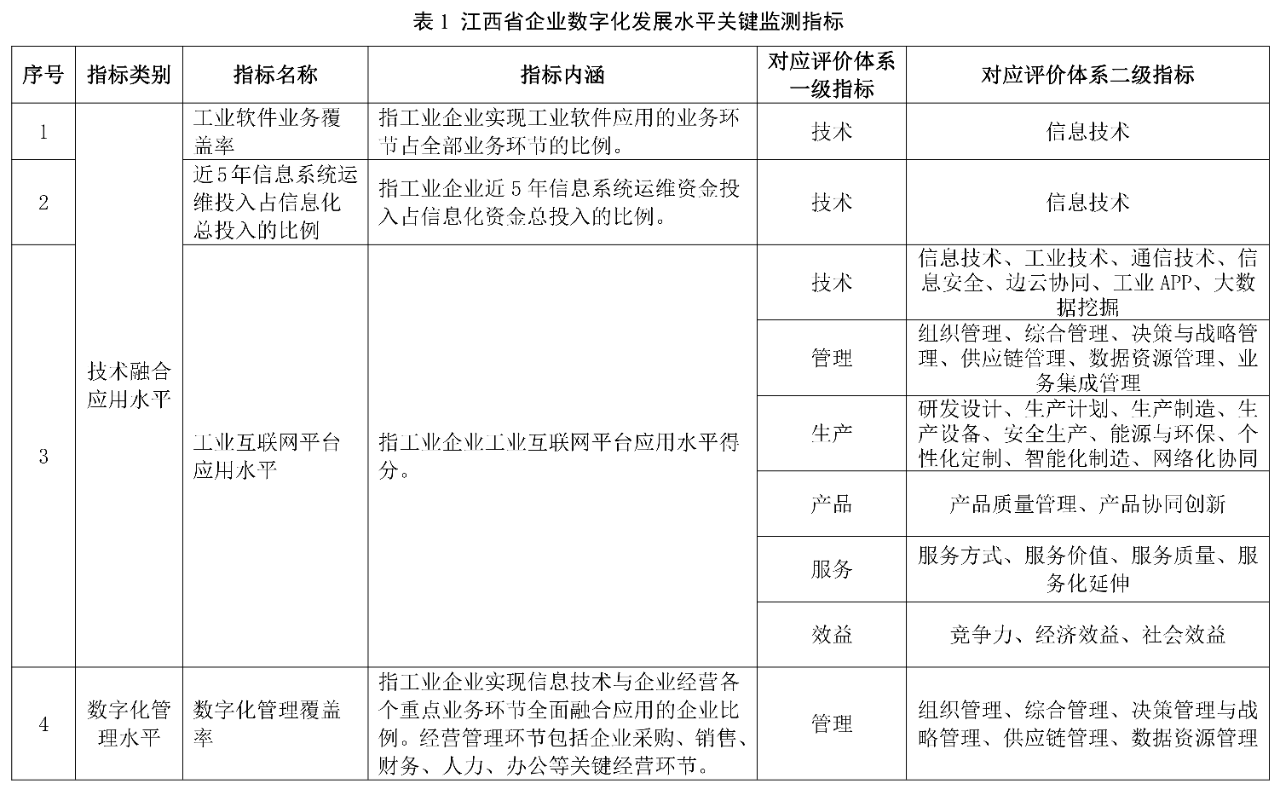 江西省制造业数字化综合发展水平评价指标体系融合了企业两化融合度评价、两化融合系列评估规范、工业互联网平台应用水平评价、中小企业数字化转型评测等指标,结合江西省产业特色,重点围绕企业生产管理的关键环节和主要过程,分技术、管理、生产、产品、服务和效益6个维度,由35个指标组成。