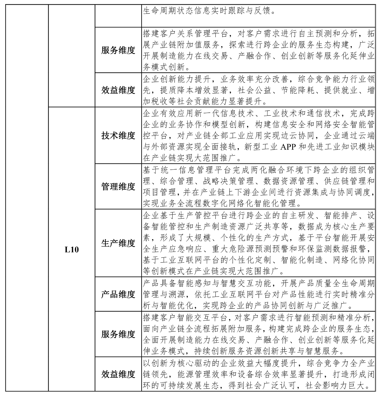 L10级:企业有效应用了新一代信息技术,实现了企业生产运营过程的智能化管理,形成了大规模、个性化的生产方式,基于工业互联网平台完成跨企业的业务协作,平台应用创新模式和新型工业APP在产业链实现大范围推广,企业通过云端与外部资源实现全面接轨,建成数字化产业链生态,持续延伸服务模式,全产业竞争力与社会影响力显著提升。