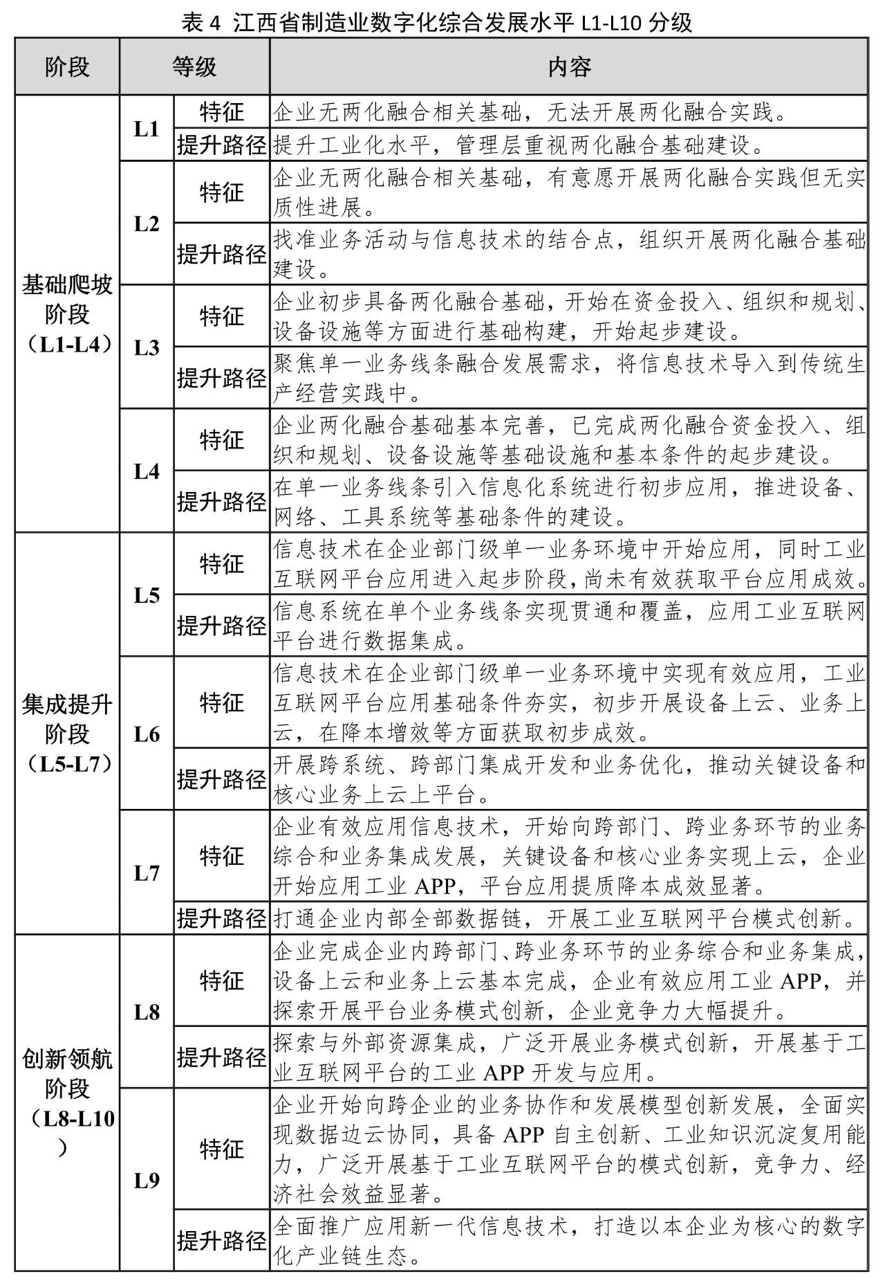 为深入贯彻党的二十大提出的促进数字经济与实体经济深度融合、推动数字化转型的决策部署,落实《“十四五”两化深度融合发展规划》关于推进两化融合度评价的工作任务,深入推进我省制造业数字化,探索中国特色数字化转型“江西方案”,我省构建了制造业数字化综合发展水平评价指标体系(简称“评价体系”),在全省开展制造业数字化综合发展评价普查。评价体系依据《企业信息化和工业化融合度评价要求》(T/CESA1174-2021)、《工业企业信息化和工业化融合评估规范》(GB/T23020-2013)、《工业互联网平台企业应用水平与绩效评价》(GB/T41870-2022)标准规范及《中小企业数字化水平评测指标(2022年版)》等成熟体系编制,并经过样本企业试点、区域试点、行业试点三个阶段验证,对指标体系进行了优化和完善。为更好从微观和宏观角度跟踪数字化转型态势,结合评价指标体系采集项内容构建了面向企业和面向区域的监测指标,同时对指标体系评价维度等级特征进行了定义,充分考虑与已有指标体系评价等级划分衔接性和江西实际情况,形成了“三阶十级”的江西省制造业数字化综合发展水平等级,并给出了每个等级向下一个等级跃升的提升路径。