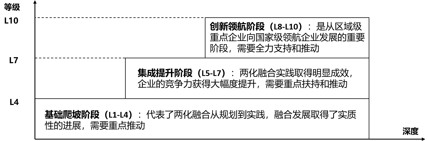 集成提升阶段对应L5-L7级,是企业数字化转型快速发展阶段,信息化生产成为企业核心生产手段,数字化转型从单项覆盖向集成提升的转变,工业互联网平台应用效益显现,数字化转型实践取得明显成效。