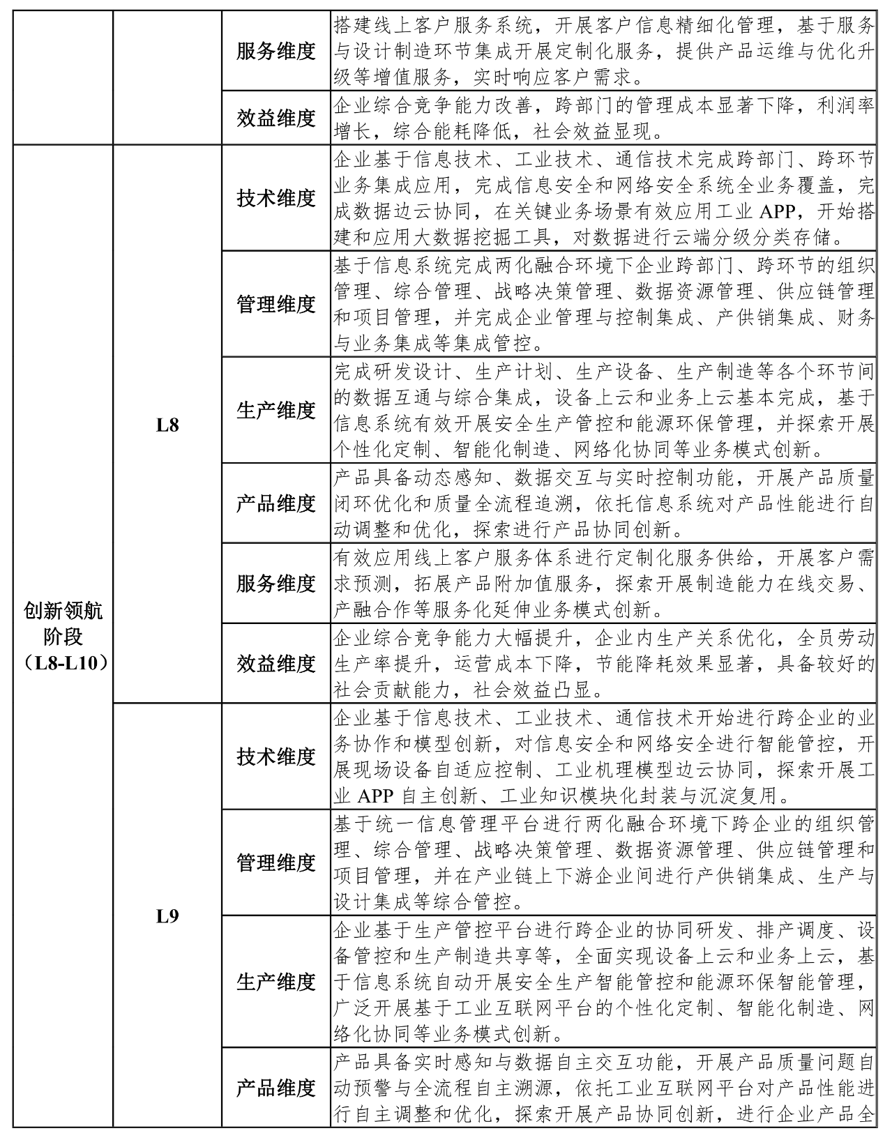 创新领航阶段对应L8-L10级,是企业数字化发展全面赶超阶段,企业数字化转型从集成提升向创新突破转变,企业的资源协调能力突破单独企业边界,形成具备企业特色的融合发展新型模式。