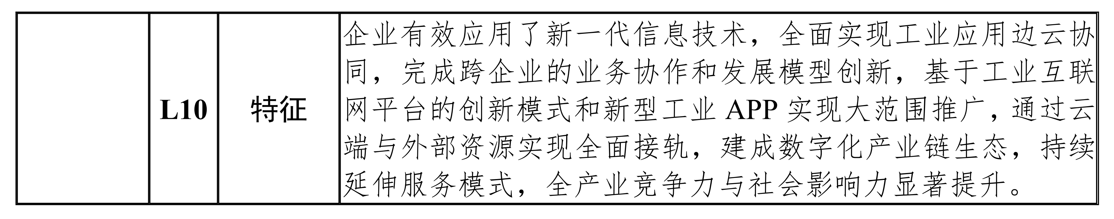 L9级:企业的数字化转型建设从企业内向企业外拓展,依托工业互联网平台进行跨企业的业务协作,企业全面实现设备上云和业务上云,能够基于自身需求进行APP自主创新和工业知识沉淀复用,广泛开展基于工业互联网平台的发展模式创新,企业的竞争力、经济社会效益显著。