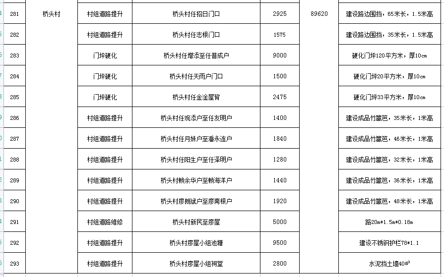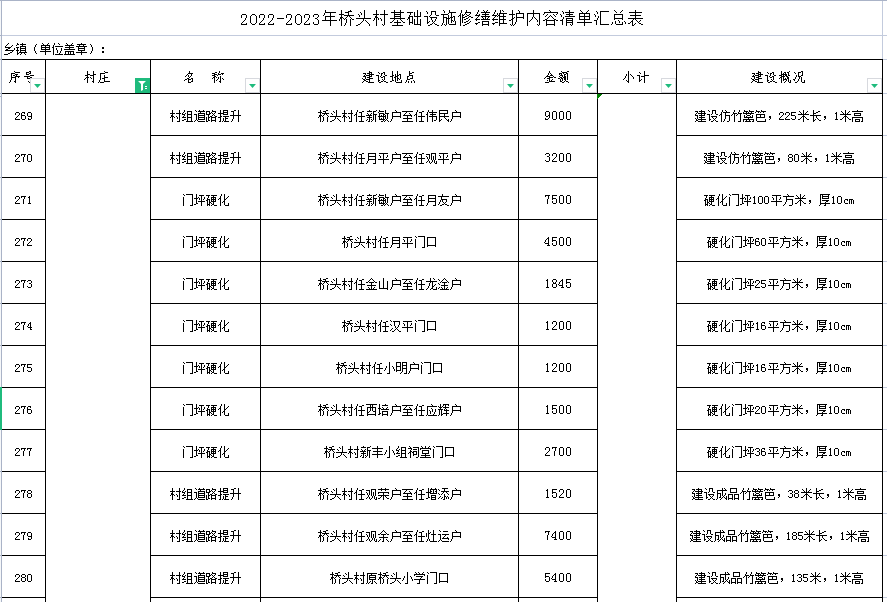 2022-2023年桥头村基础设施修缮维护内容清单汇总表