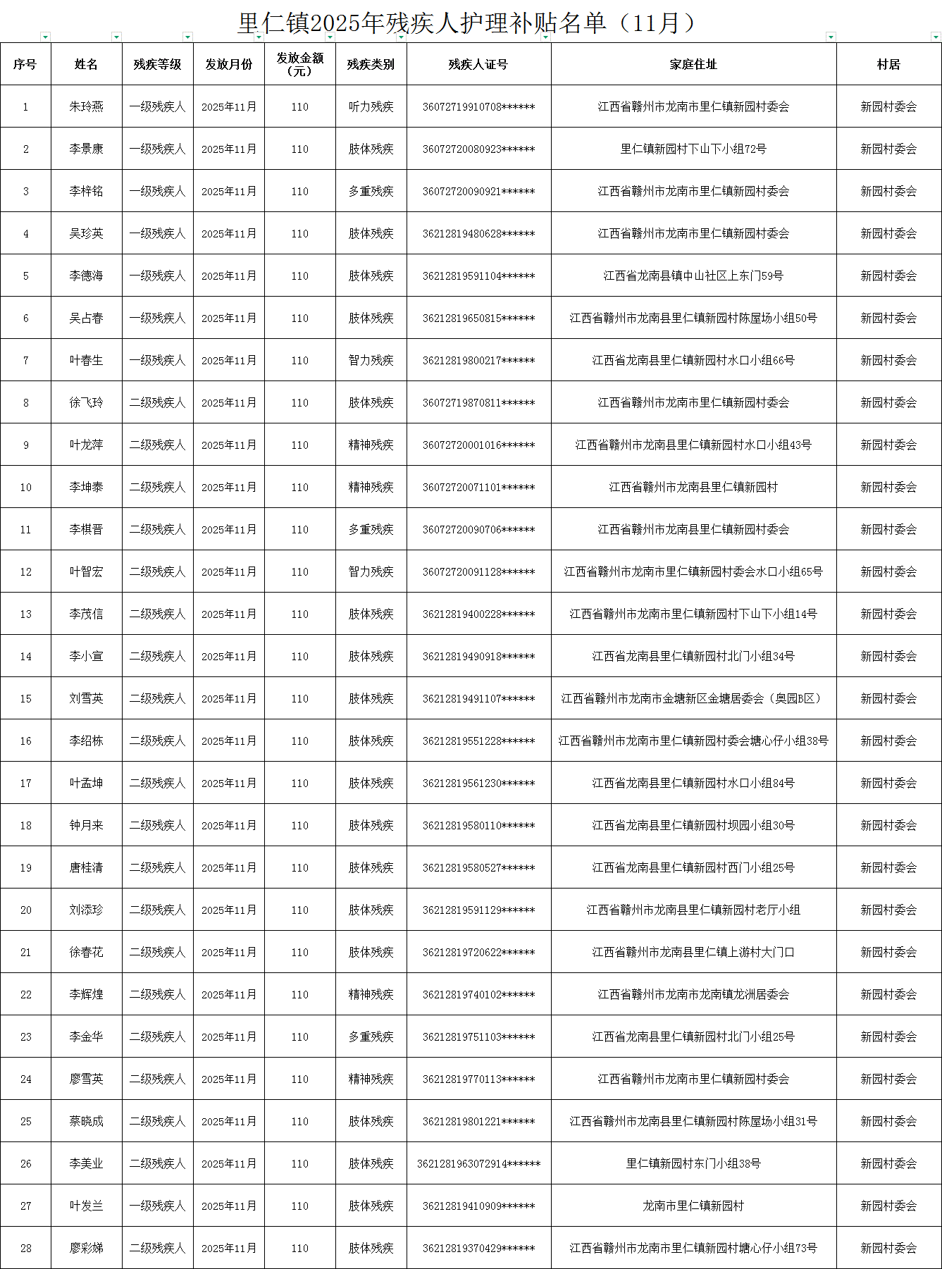 里仁镇2025年残疾人护理补贴名单(11月)