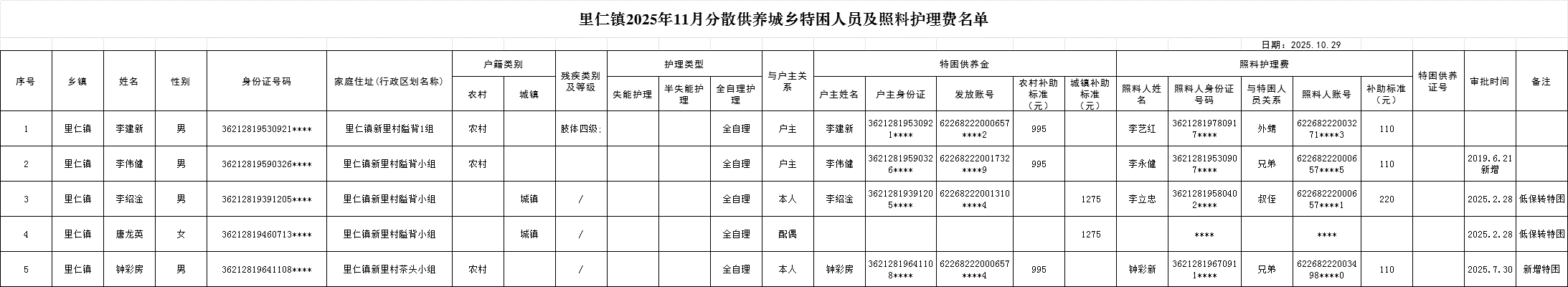 里仁镇2025年11月分散供养城乡特困人员及照料护理费名单