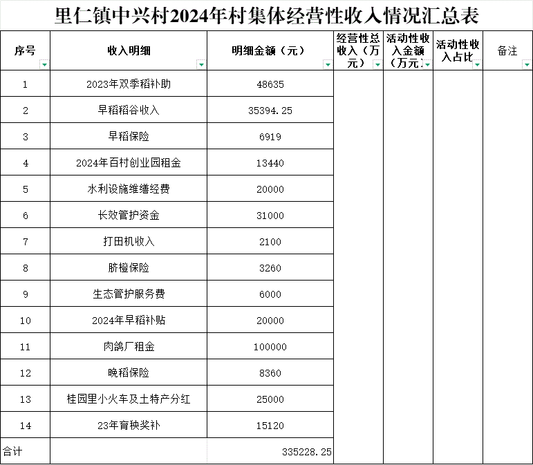 里仁镇中兴村2024年村集体经营性收入情况汇总表