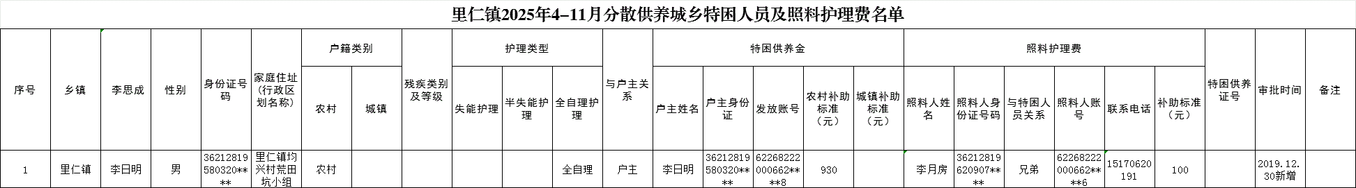 里仁镇2025年4-11月分散供养城乡特困人员及照料护理费名单