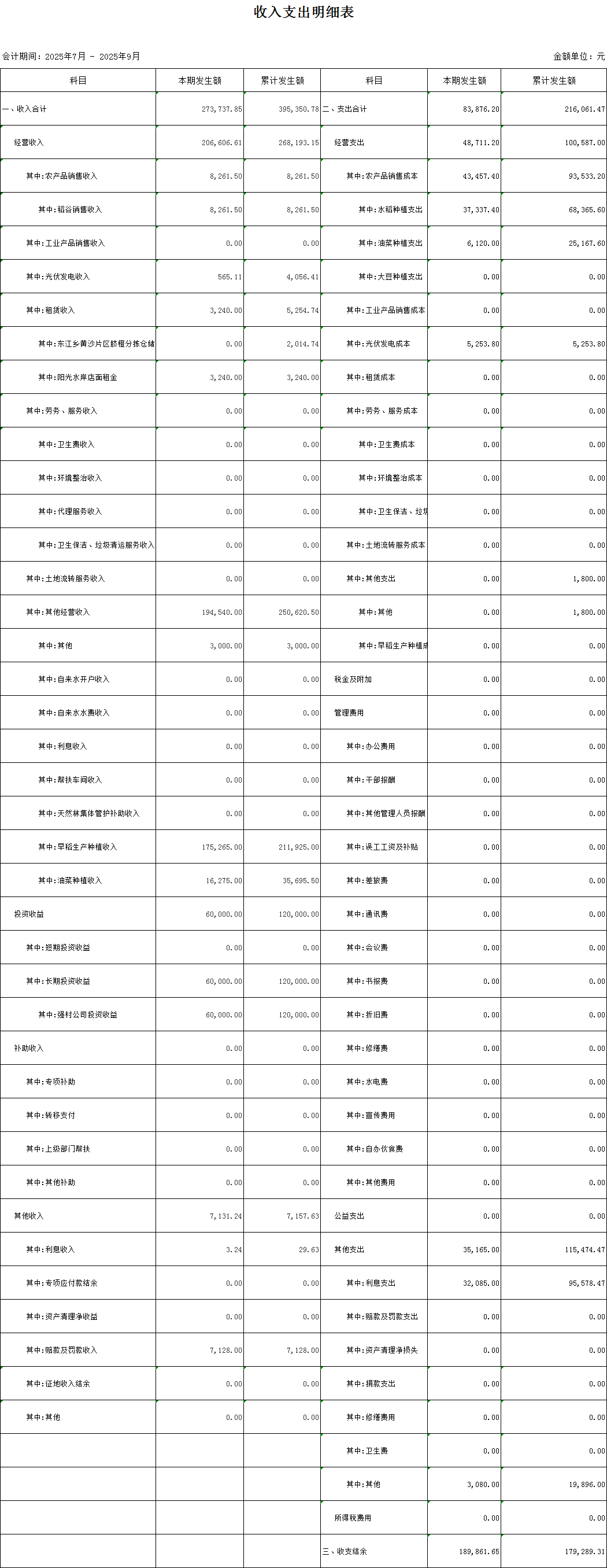 新岭村合作社村级收入支出明细第三季度