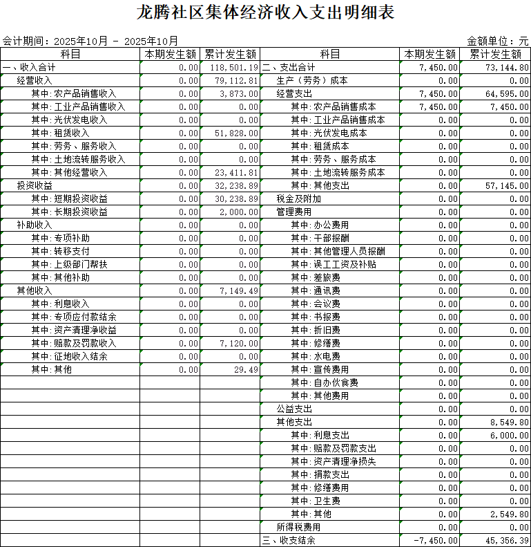龙腾社区集体经济收入支出明细表(2025年10月)