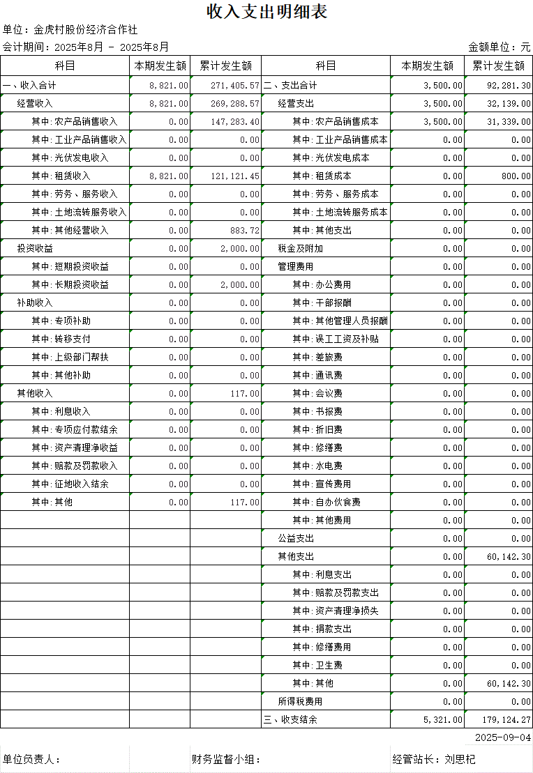 金虎合作社8月村级收入支出明细表