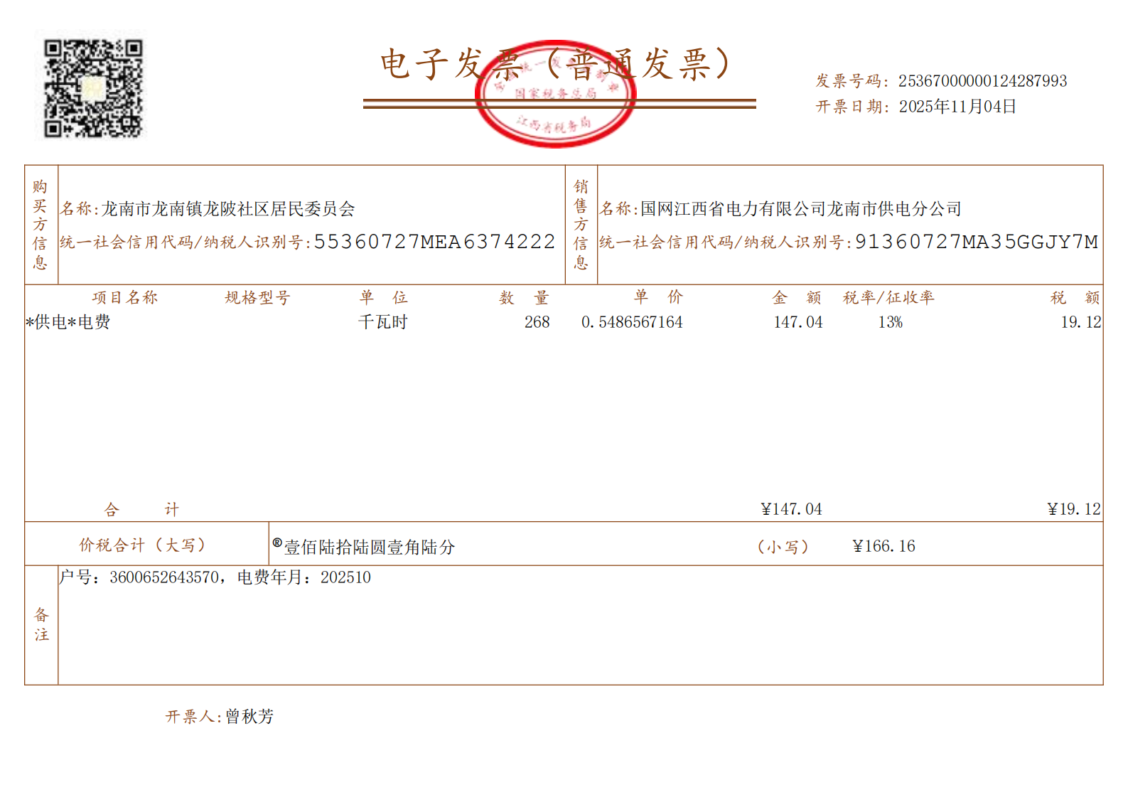 龙陂社区2025年10月电费
