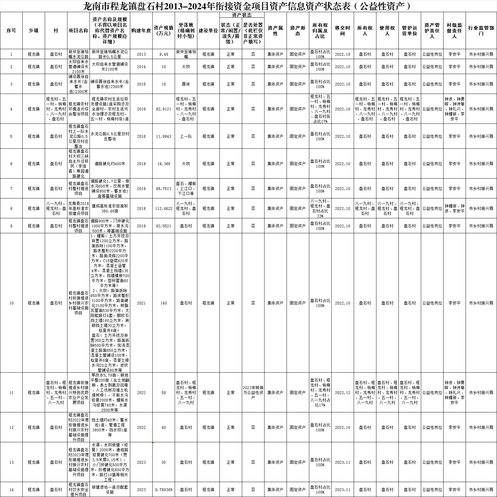龙南市程龙镇盘石村2013-2024年衔接资金项目资产信息资产状态表(公益性资产)