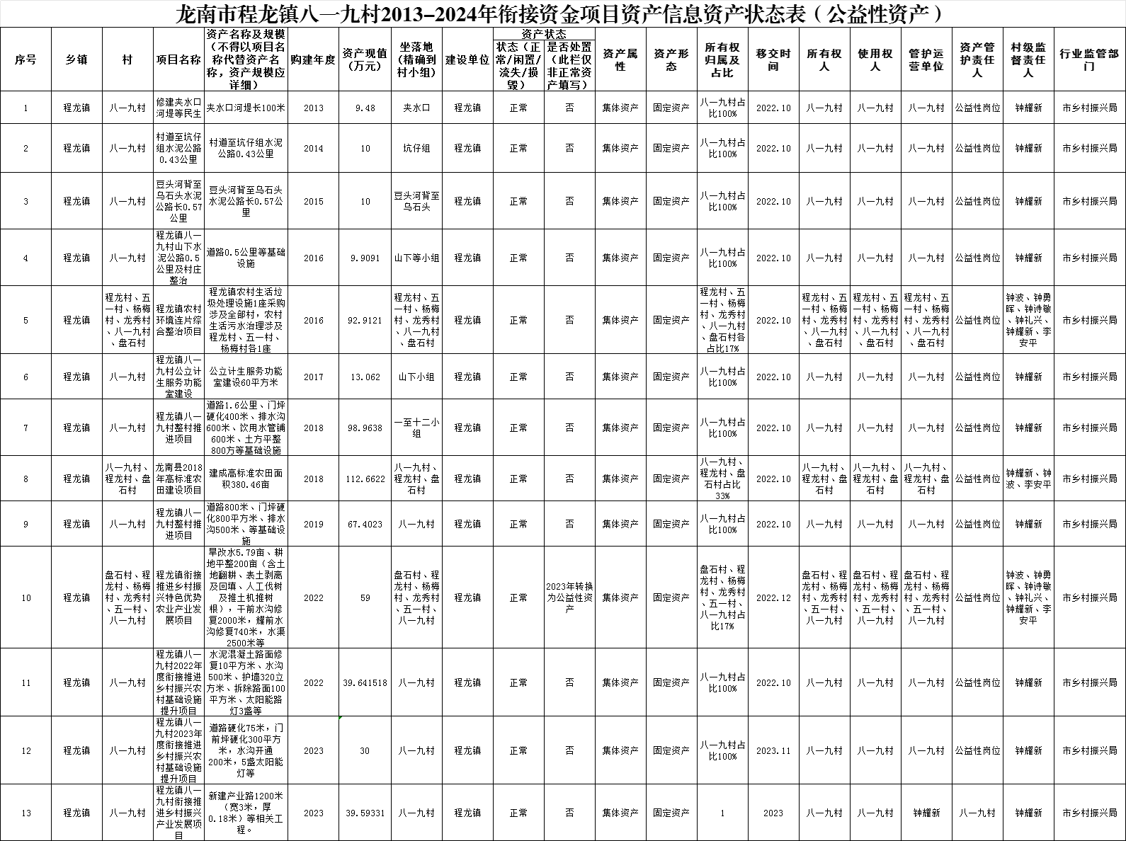 龙南市程龙镇八一九村2013-2024年衔接资金项目资产信息资产状态表(公益性资产)