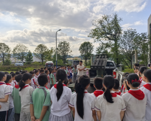 活动伊始,气象工作人员为学生们展示了 “人工增雨” 这一硬核科技,详细讲解了人工增雨操作规程,现场模拟演示了“人工增雨” 作业全过程 。当工作人员讲解如何借助科技手段 “唤醒” 云水资源时,学生们眼中满是好奇,现场提问声此起彼伏,探索热情瞬间被点燃。随后,师生们移步气象观测场,这里的百叶箱、雨量传感器等气象仪器如同 “科学宝藏”,吸引学生们驻足观察。气象工作人员围绕每一款仪器的功能、数据采集原理展开细致讲解,层层递进的介绍让学生们对气象数据的 “诞生过程” 有了更深入、更具象的认知。在气象台参观环节,实时滚动的卫星云图、严谨规范的业务操作流程,让师生们直观感受到智慧气象的精准与高效。此外,活动还设置气象科普知识专题讲座,工作人员结合雷电防御、暴雨避险等生活实例,深入浅出地讲解气象基础知识与灾害防御要点,讲座中穿插的趣味问答互动更是将氛围推向高潮 ——“遇到雷雨天气该躲在哪里?”“高温天如何预防中暑?”,学生们积极举手抢答,在互动中加深对气象科学的理解,进一步激发了探索自然、学习科学的浓厚兴趣。